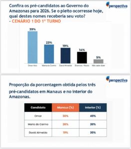 No levantamento realizado com 2.500 entrevistados, entre os dias 17 e 26 de dezembro, por telefone, em todo o Amazonas, a Professora Maria do Carmo se mantém em segundo lugar, a exemplo de pesquisas anteriores, o que indica sua participação no segundo turno das Eleições 2026. Maria aparece em amplo crescimento com 23% das intenções de voto. O senador Omar Aziz (PSD) – que tem apresentado queda e alta rejeição – surge com 39%, enquanto David Almeida tem 19%.